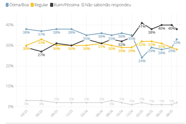 A série histórica demonstra que a avaliação do governo começou a subir em fevereiro de 2025. Naquele momento, 24% dos brasileiros avaliavam o governo Lula como ótimo ou bom, ao passo que 41% o via como ruim ou péssimo.