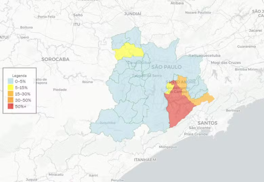 Em São Bernardo, 74% das os clientes da Enel ficaram sem energia, com cerca de 271 mil endereços sem fornecimento. Na cidade de Santo André e Diadema, respectivamente, 29,6% e 14% dos imóveis estavam sem luz até às 13h.