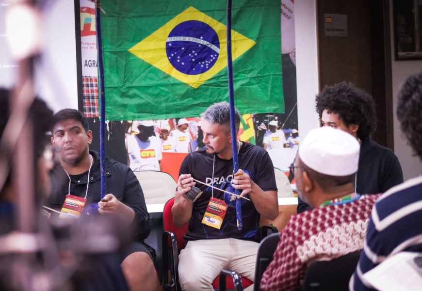 Os cantos do Hino Nacional e do Hino à Negritude abriram os trabalhos do evento, além da apresentação do grupo de capoeira Dragão do Mar, que levaram sua cantoria e fez todos os presentes acompanharem.
