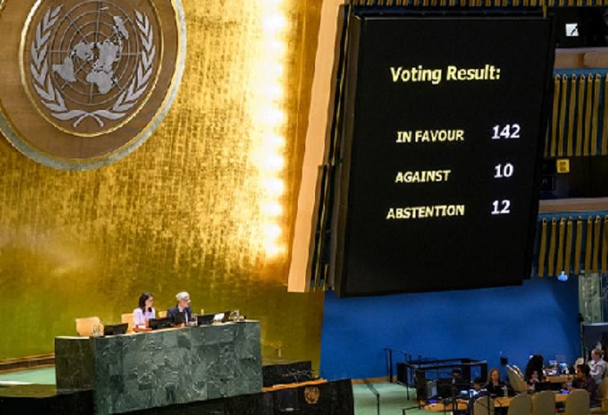 Por ampla margem de 142 a favor, 10 contra e 12 abstenções a Solução dos Dois Estados e medidas para concretizá-la foram aprovadas na Assembleia Geral da ONU, a principal o estabelecimento do Estado da Palestina